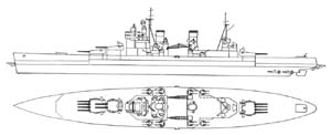 bridge, designed as hangar, is now used as a cinema. Engineering Notes. - Improvements in boiler design have reduced boiler weights by about 15 per cent as compared with Nelson and Rodney. On trials these ships exceeded 28 kts. Easily with about 112,000 S.H.P. Gunnery Notes. - 14 inch guns are a new model, with an effective range greater than the 15 inch mounted in earlier ships, as measured by the perforation of any given thickness of armour. From photographs, elevation of 14 inch guns would appear to be at least 40°. Inclusive cost of armament (including fire control installation costing GBP 213,000) has been officially stated as GBP 2,900,000. Armour Notes. - Turret weights are 1,500 tons for quadruple 14 inch; 900 tons twin 14 inch; 80 tons 5,25 inch. |