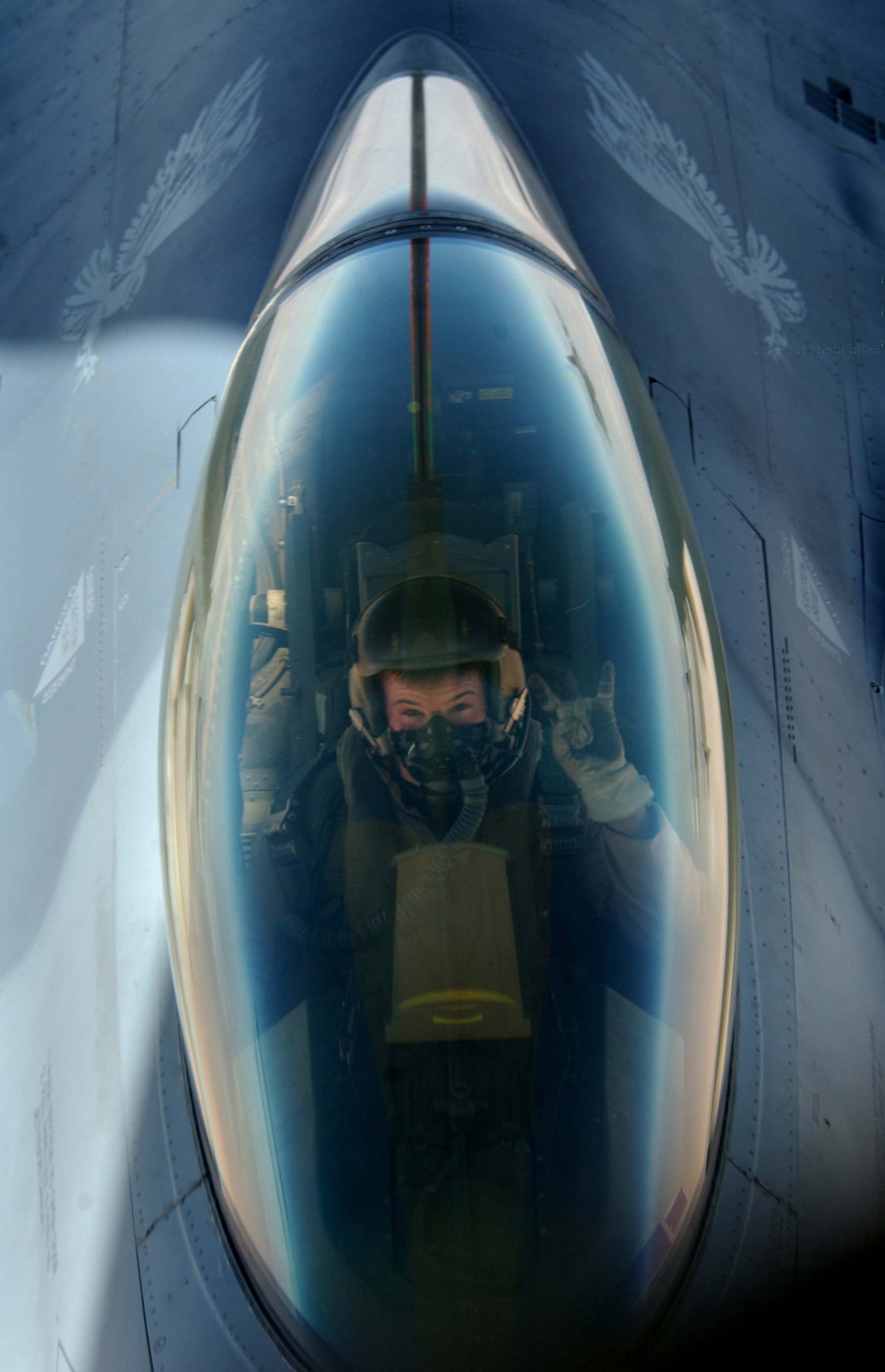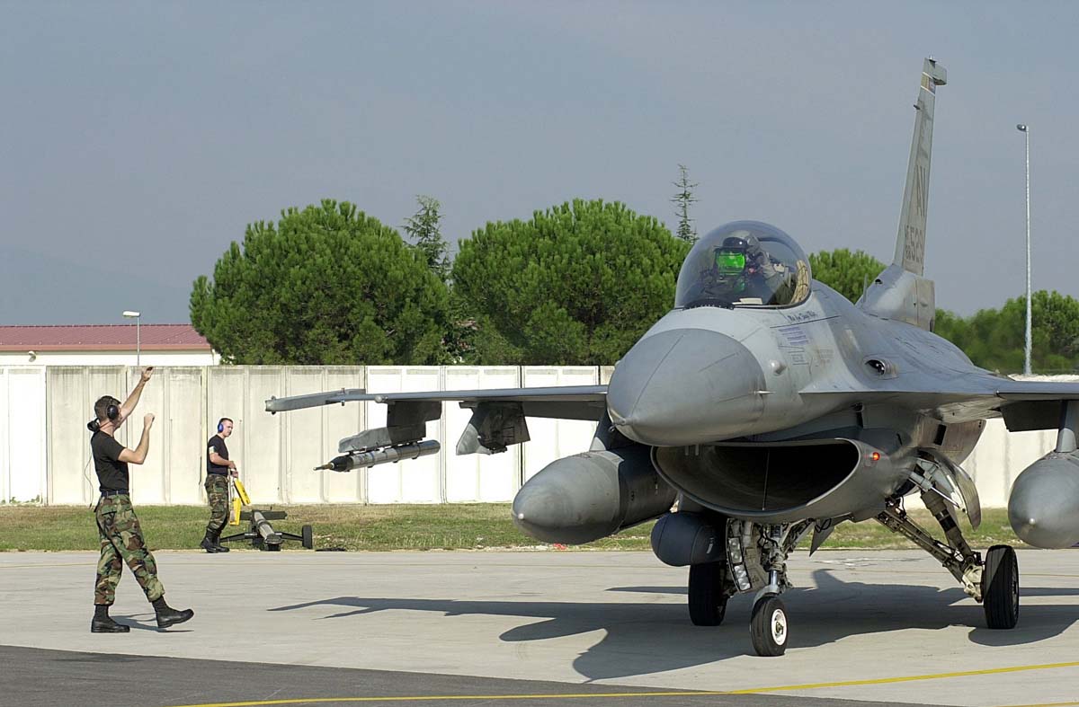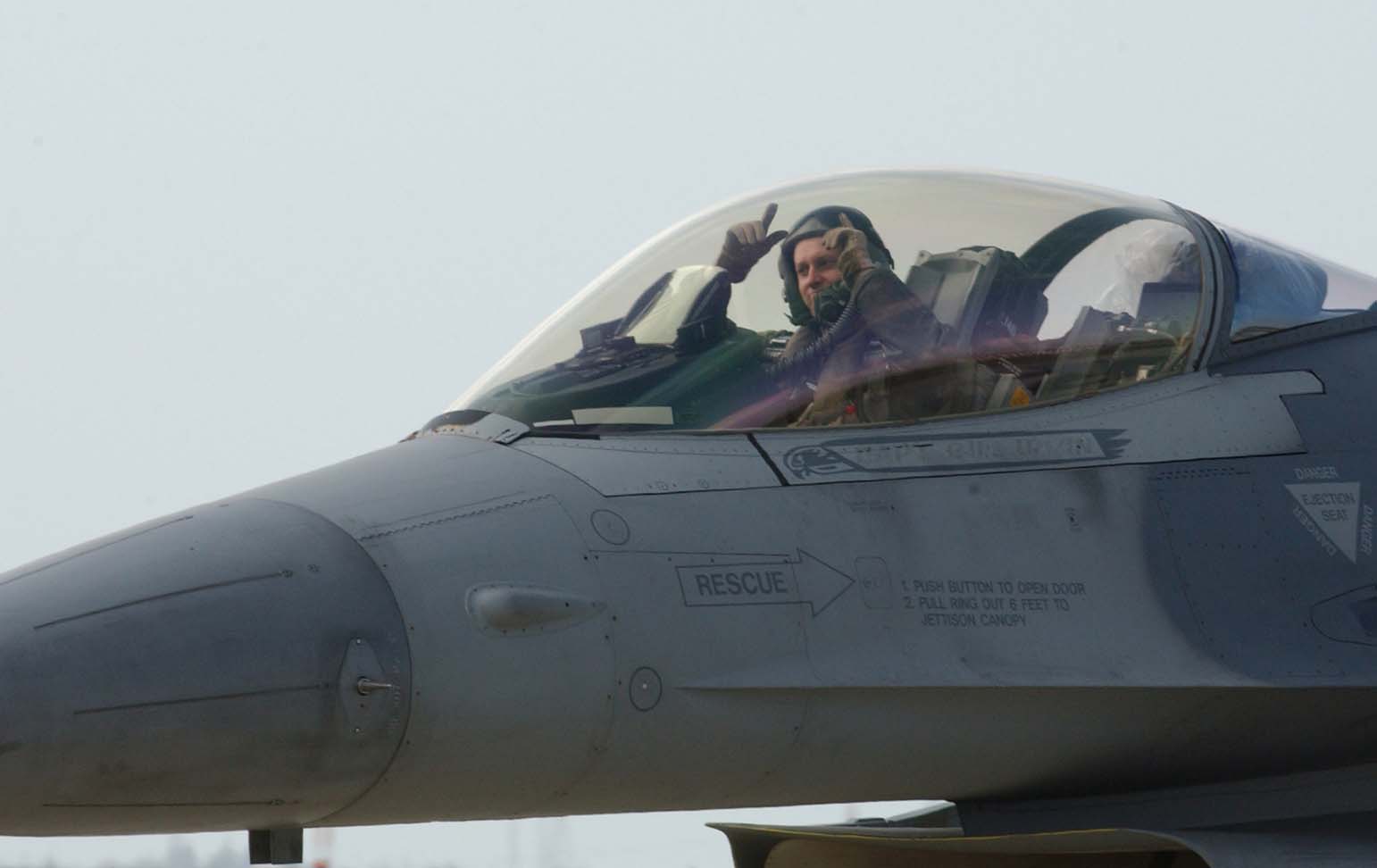 FILE PHOTO -- Senior Airman Chris Harvey, 510th Crew Chief, gives Captain Scott "Fester" Fredrick, 510th Fighter Squadron, Aviano Air Base, Italy, the traditional "Buzzard Claw sign" prior to his sortie on 11 Oct 2001. Fredrick will be flying a Surface Attack Tactics day sortie, (SAT-Day) which is designed to develop proficiency in day surface attack tactics. (U.S. Air Force photo by Tech. Sgt. Dave Ahlschwede)