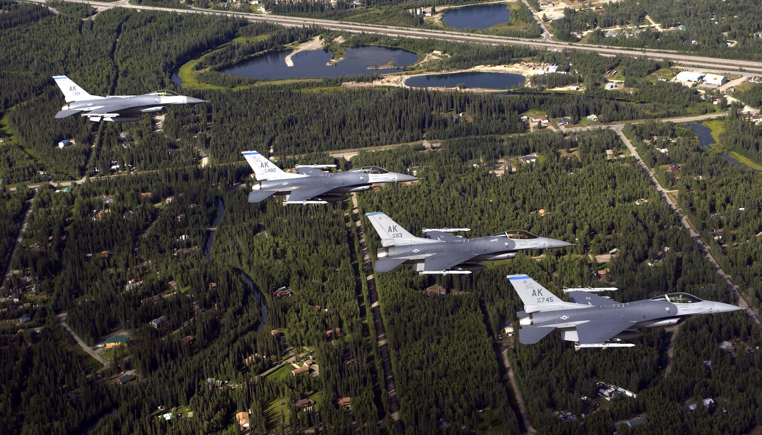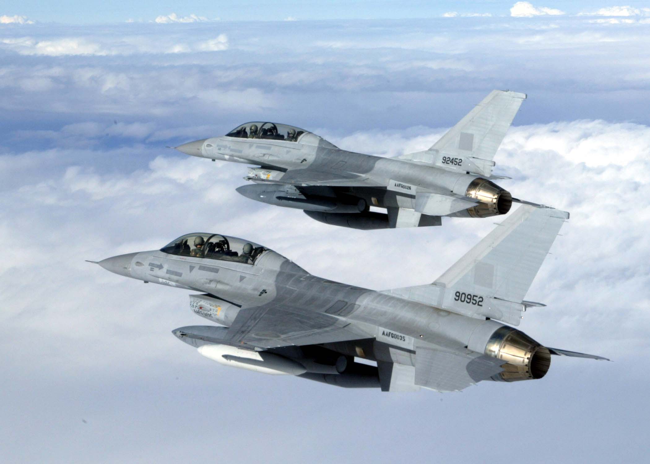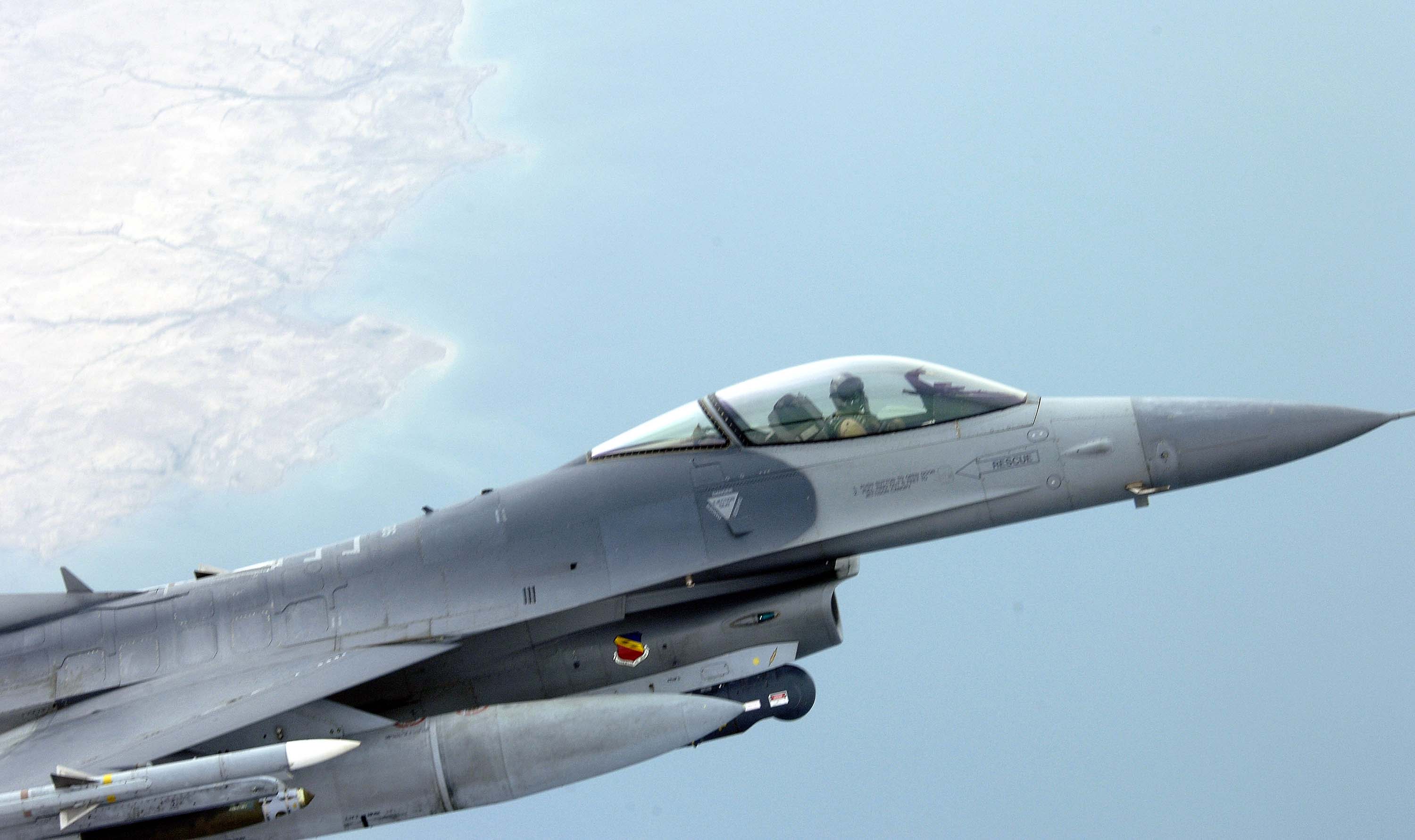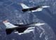 OPERATION NOBLE EAGLE --Two Air-Defense Fighter F-16A Fighting Falcons from the North Dakota Air National Guard’s 178th Fighter Squadron fly in formation Nov. 17, 2001 during a combat air patrol mission over Washington in support of Operation Noble Eagle. North American Aerospace Defense Command had more than 100 ANG and Air Force Reserve fighters from 26 locations providing homeland defense, with 100 additional fighters backing them up. Additionally, more than 20 ANG and AFRES tankers are airborne every day to keep fighters refueled. (U.S. Air Force photo by Staff Sgt. Greg L. Davis)