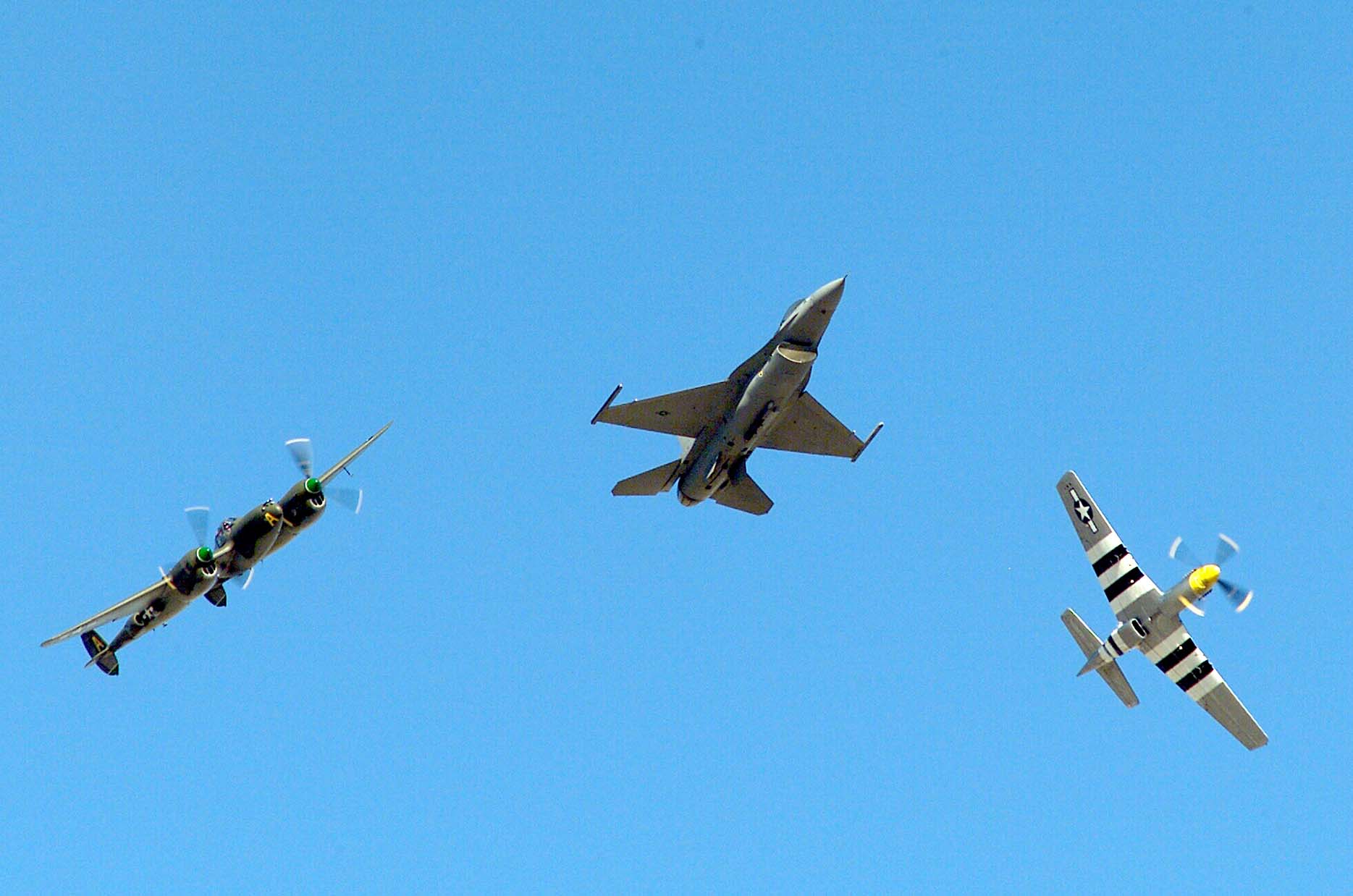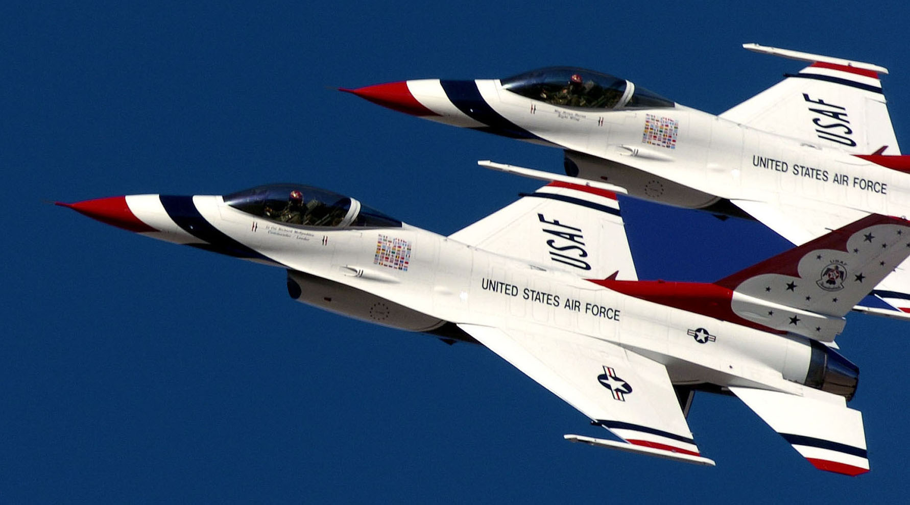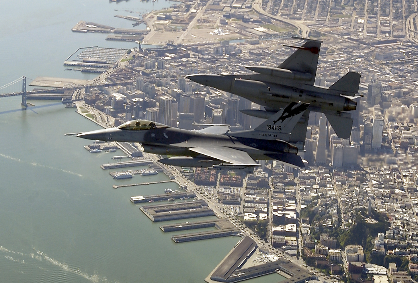 OPERATION NOBLE EAGLE --Two Air-Defense Fighter F-16A Fighting Falcons from the North Dakota Air National Guard’s 178th Fighter Squadron fly in formation Nov. 17, 2001 during a combat air patrol mission over Washington in support of Operation Noble Eagle. North American Aerospace Defense Command had more than 100 ANG and Air Force Reserve fighters from 26 locations providing homeland defense, with 100 additional fighters backing them up. Additionally, more than 20 ANG and AFRES tankers are airborne every day to keep fighters refueled. (U.S. Air Force photo by Staff Sgt. Greg L. Davis)