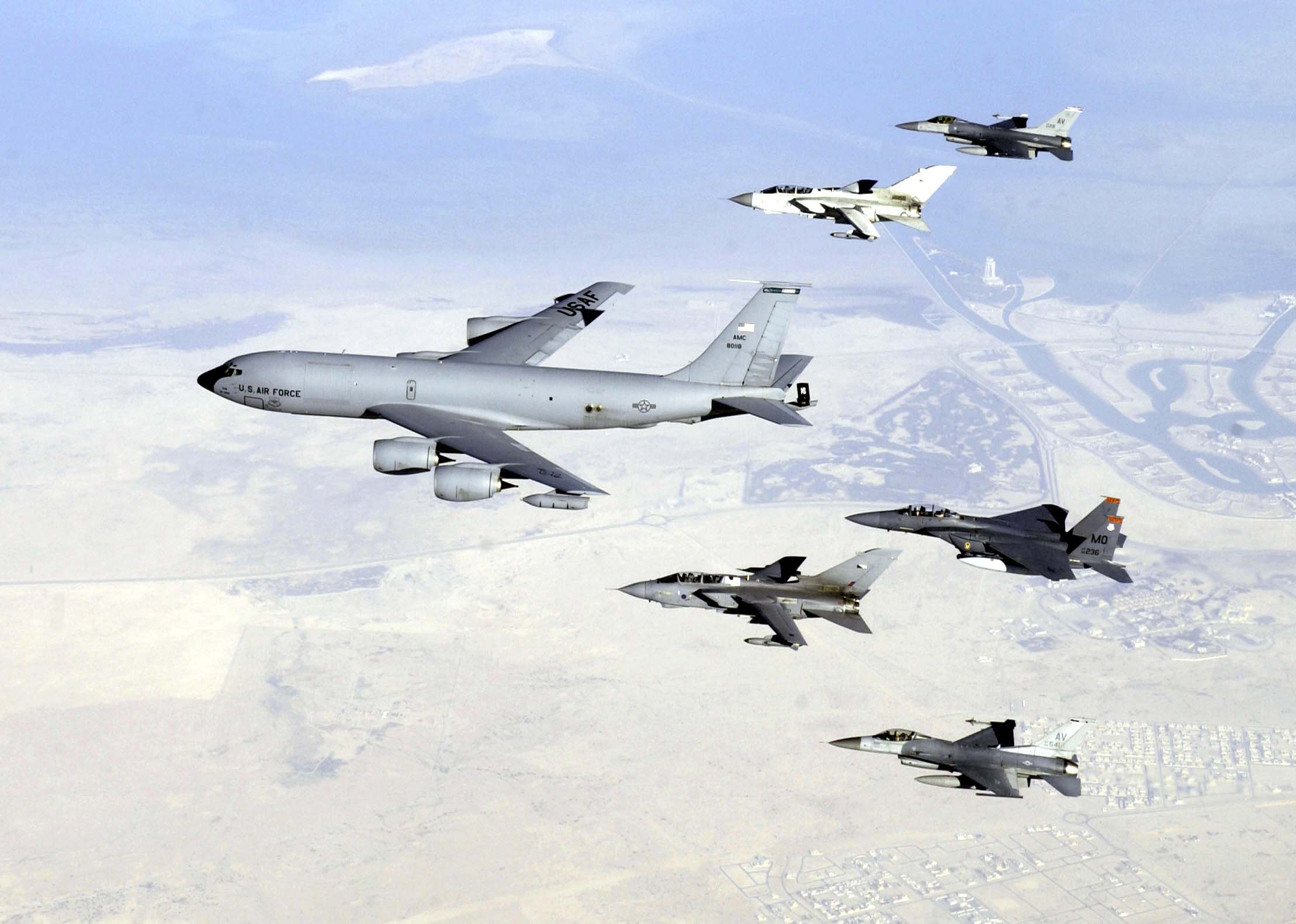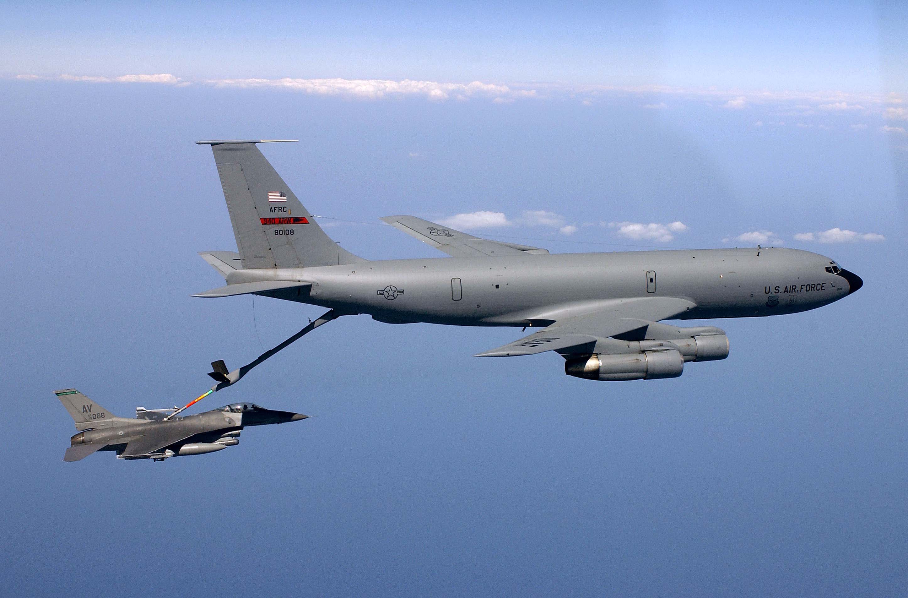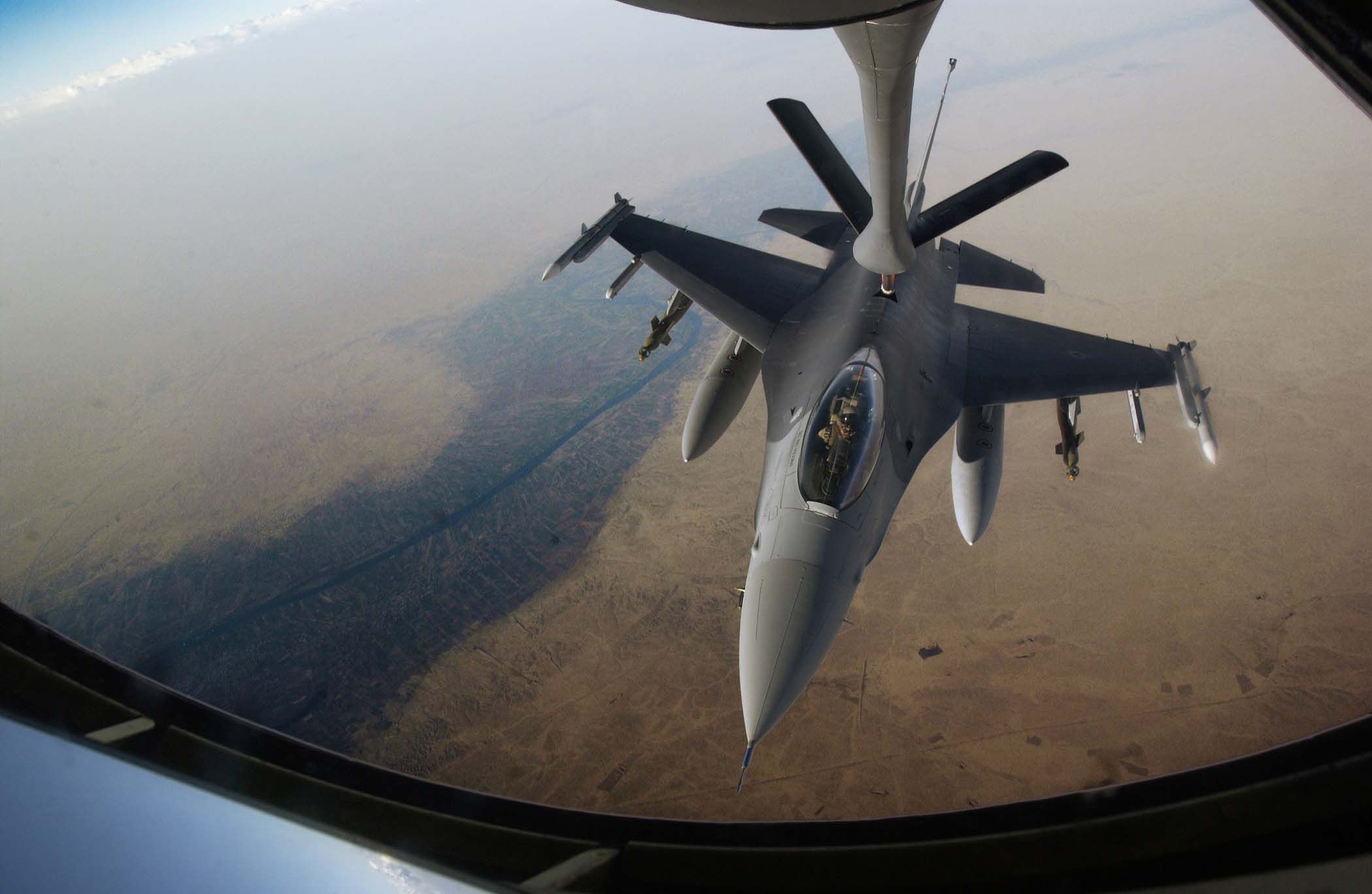 OPERATION IRAQI FREEDOM -- An F-16 Fighting Falcon refuels from a KC-135 Stratotanker in the skies near Iraq on March 22. The F-16s are from the 35th Fighter Wing "Wild Weasels," Misawa Air Base, Japan. (U.S. Air Force photo by Staff Sgt. Cherie A. Thurlby)