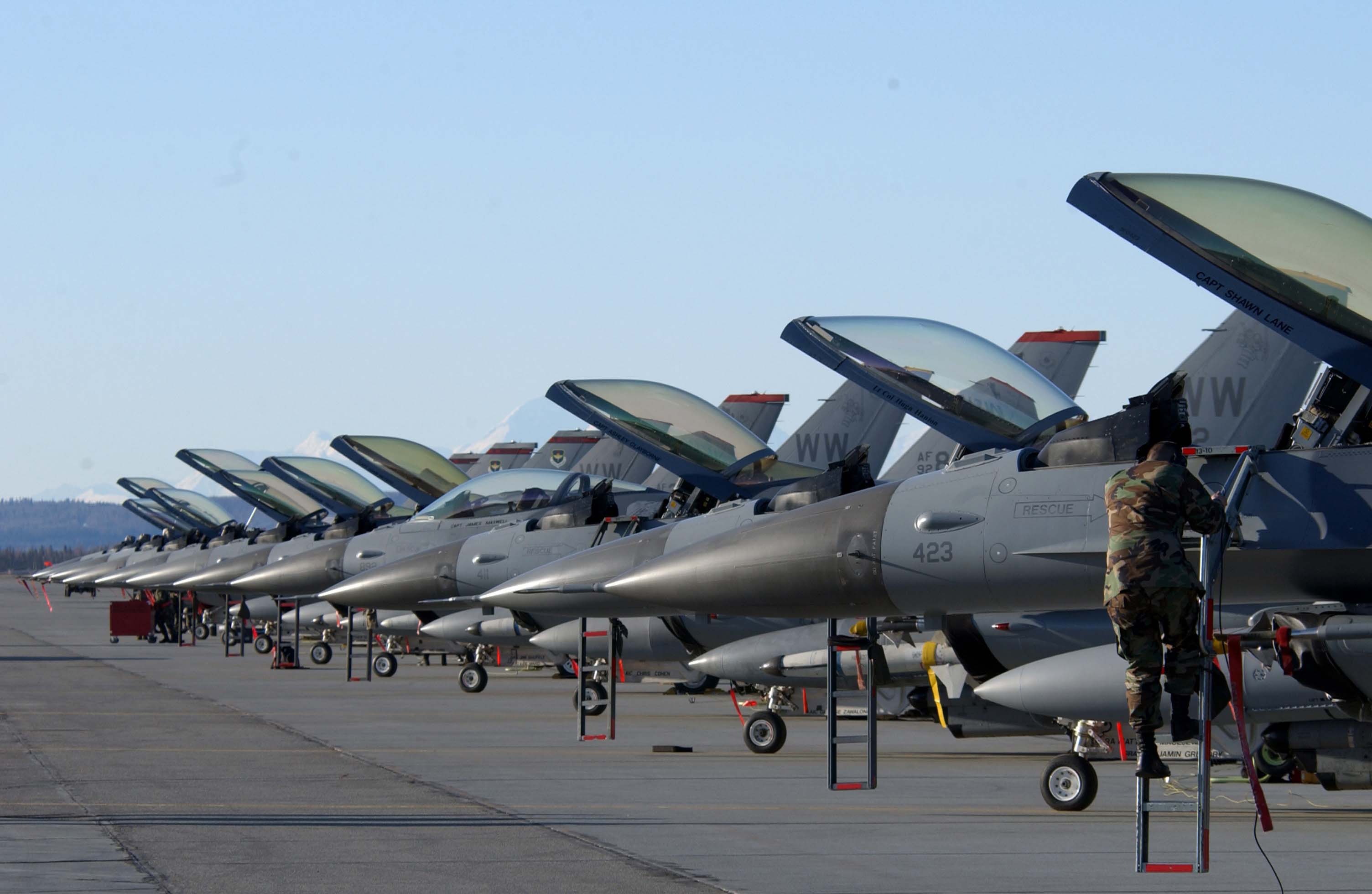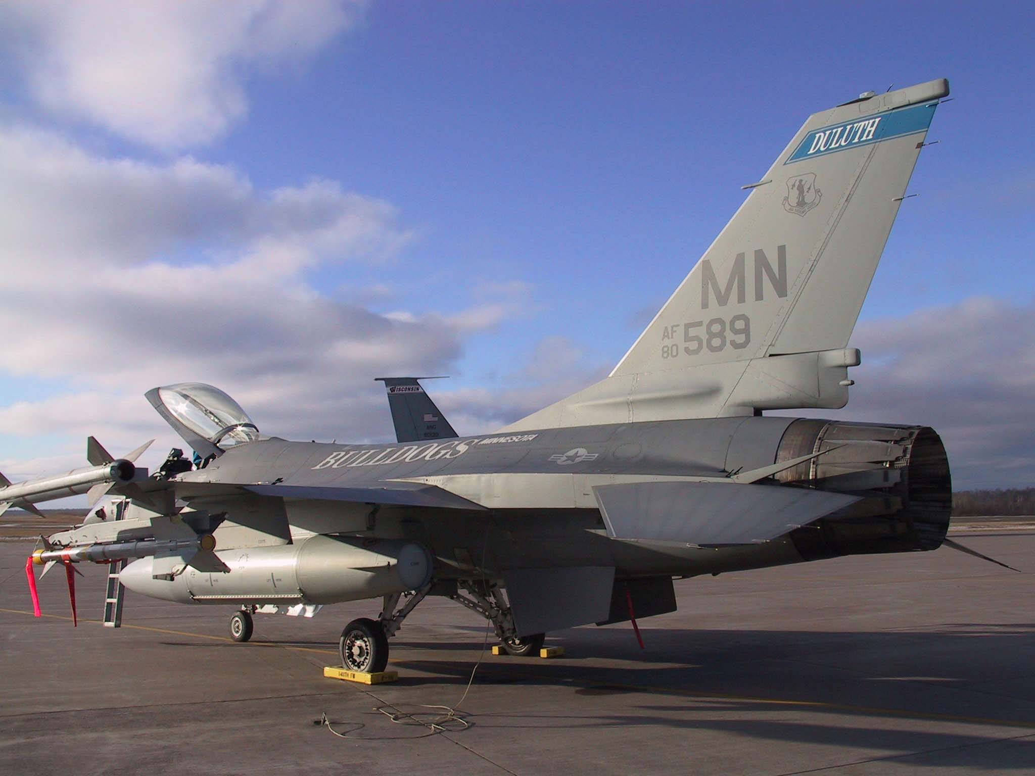 OPERATION NOBLE EAGLE -- An F-16 Fighting Falcon from the Minnesota Air National Guard’s 179th Fighter Squadron Wing stands alert in support of Operation Noble Eagle on Dec. 11. North American Aerospace Defense Command has more than 100 ANG and Air Force Reserve fighters from 26 locations providing homeland defense, with 100 additional fighters backing them up. Additionally, more than 20 ANG and AFRES tankers are airborne every day to keep fighters on station. (U.S. Air Force photo by Master Sgt. Daniel J. Schlies)