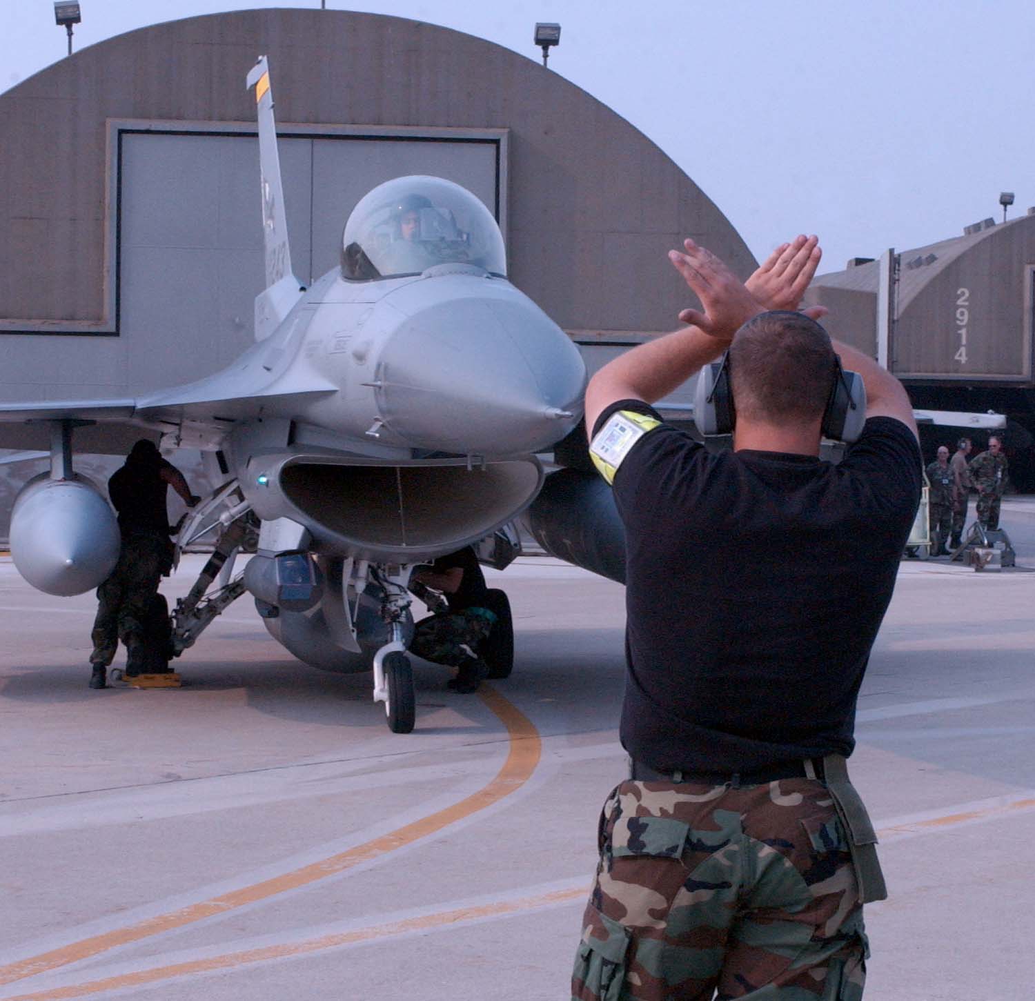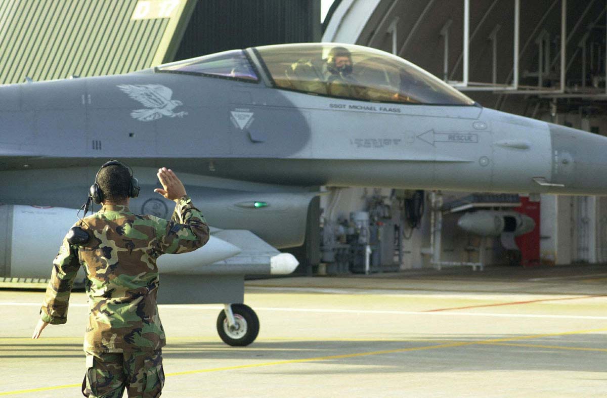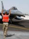 FILE PHOTO -- Senior Airman Hashim Haskins, an F-16 crew chief for the 14th fighter squadron at Misawa Air Base, Japan, guides Lt. Col. Kurt Neubauer to his parking spot after he completes 3,000 flying hours in F-16 Fighting Falcon. Neubauer is one of only 58 pilots to accomplish this feat. (U.S. Air Force photo by Staff Sgt. James R. Hart Jr.)