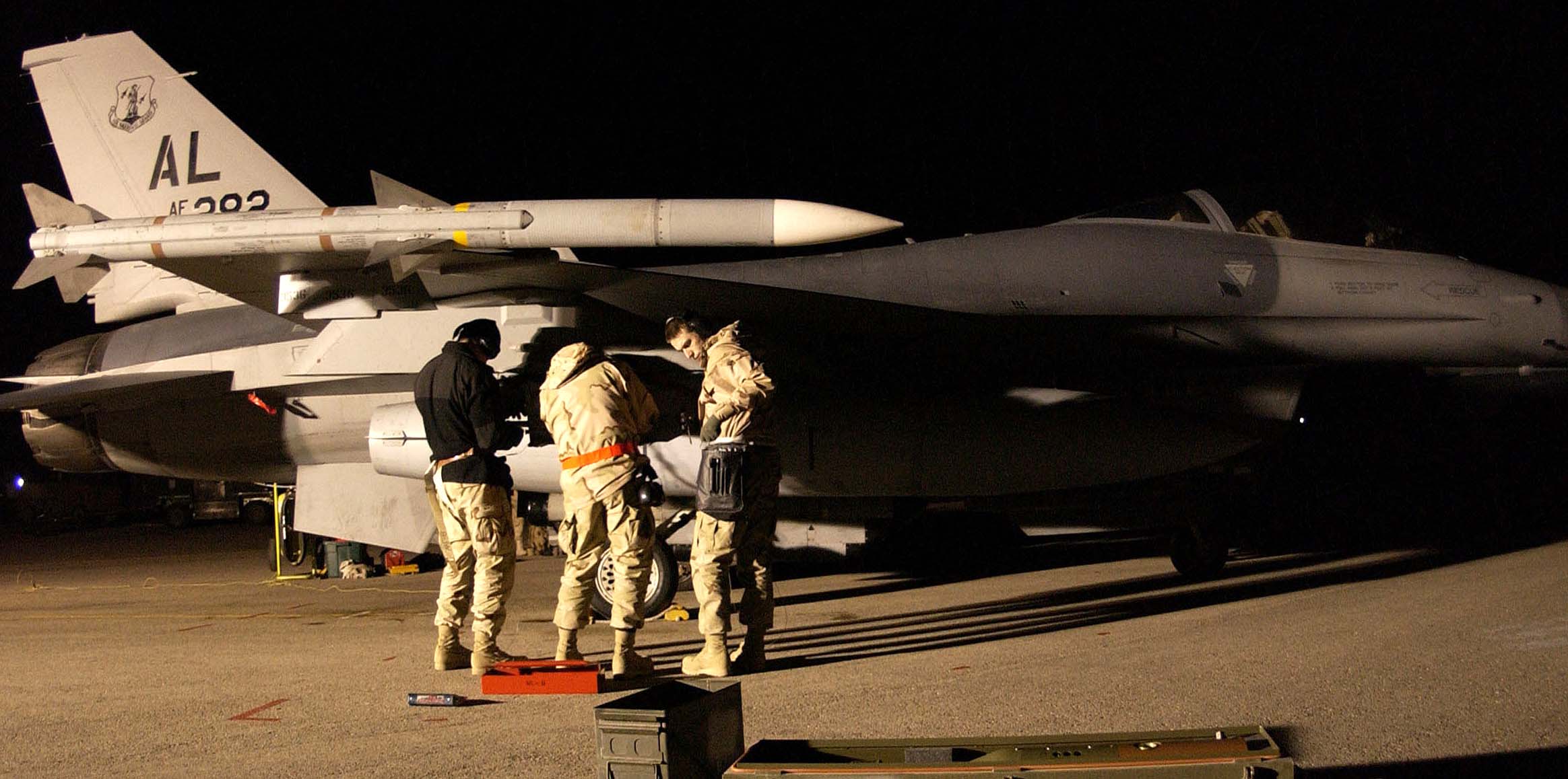 OPERATION IRAQI FREEDOM -- Crew chiefs prep F-16 Fighting Falcons for Operation Iraqi Freedom night misisons at a forward-deployed air base. (U.S. Air Force photo by Master Sgt Terry L. Blevins)
