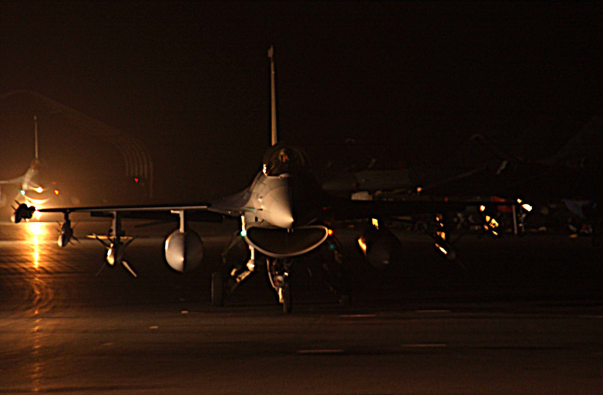 OPERATION IRAQI FREEDOM -- F-16 Fighting Falcons from the 410th Air Expeditionary Wing taxi in after a long reconnaissance mission at a forward-deployed location supporting Operation Iraqi Freedom. (U.S. Air Force photo by Airman 1st Class Lindsey M Slocum)