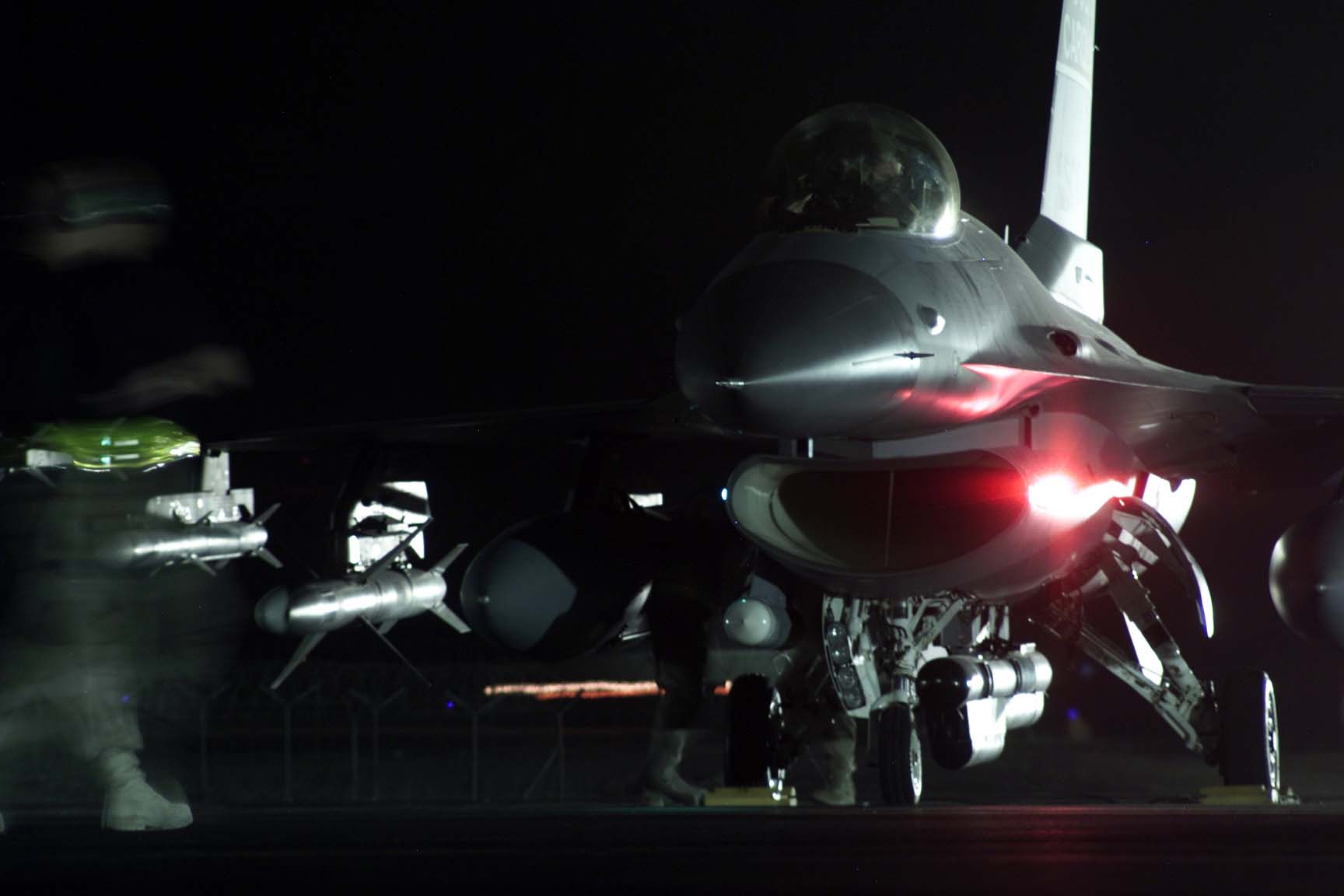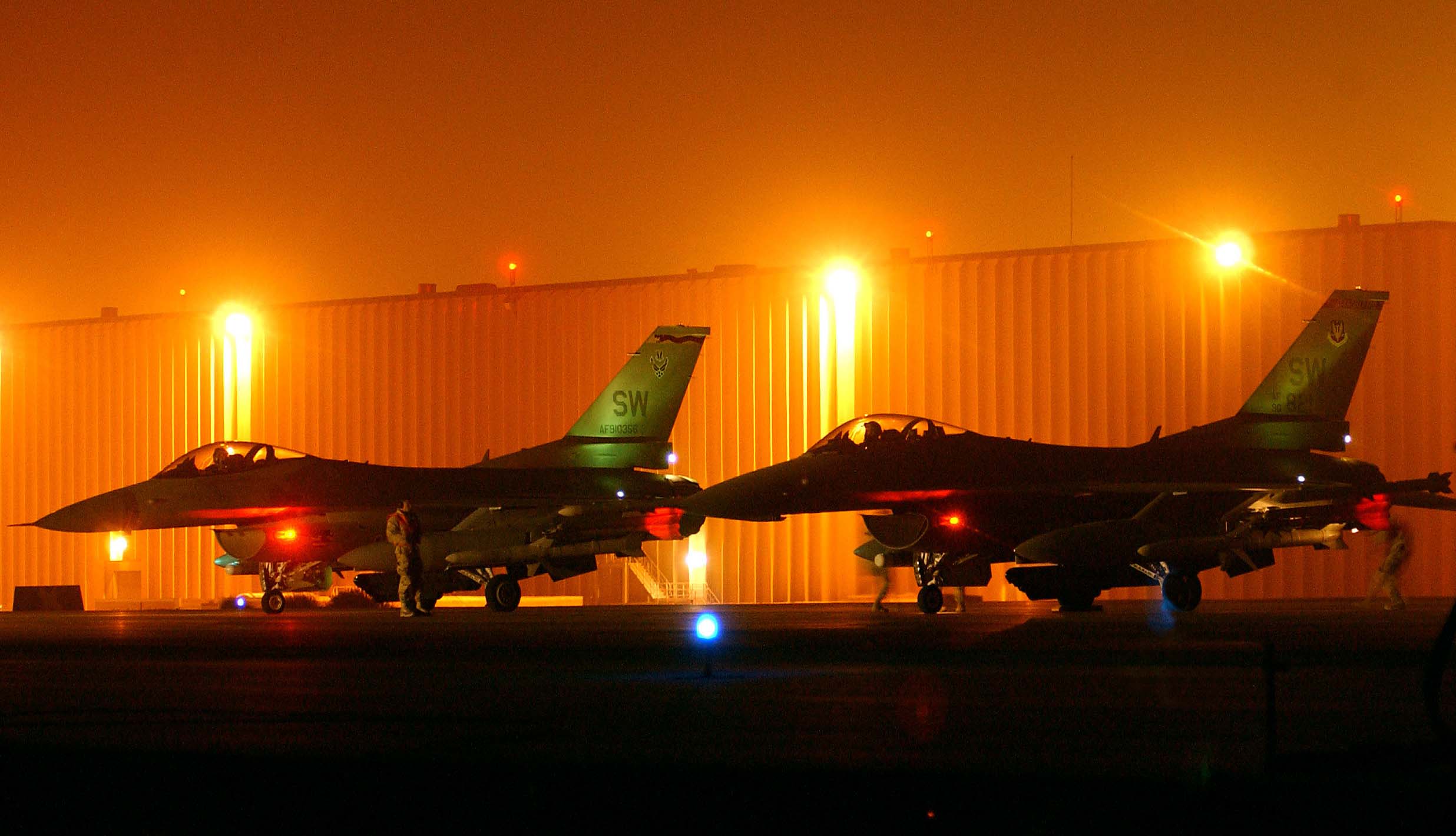 OPERATION IRAQI FREEDOM -- F-16 Fighting Falcons wait on the "hot ramp" at a forward-deployed location while maintenance crews ready the weapons for a night mission March 21. The F-16s are from the 20th Fighter Wing at Shaw Air Force Base, S.C., and they are flying Operation Iraqi Freedom missions for the 363rd Expeditionary Fighter Squadron. (U.S. Air Force photo by Staff Sgt. Matthew Hannen)