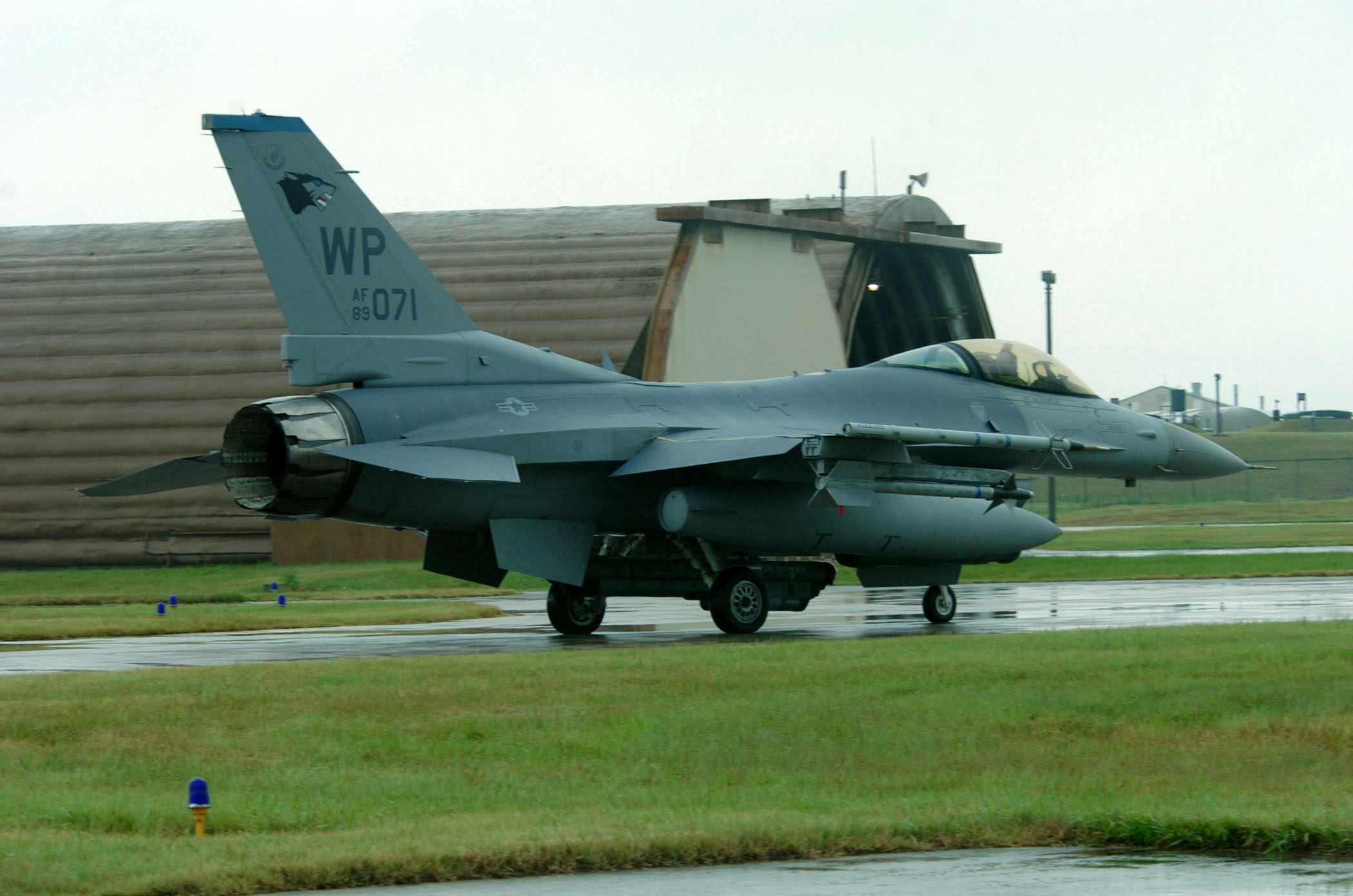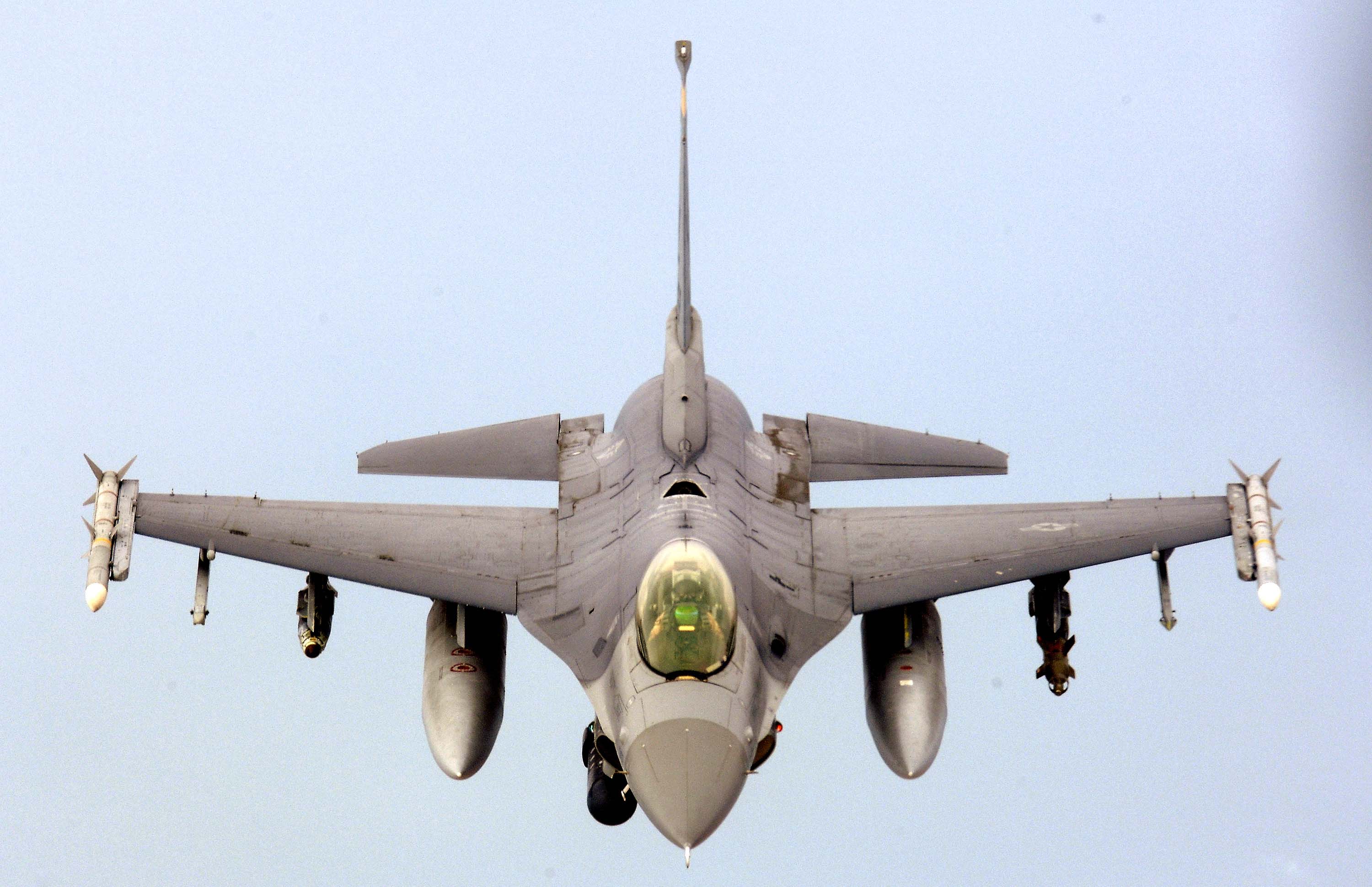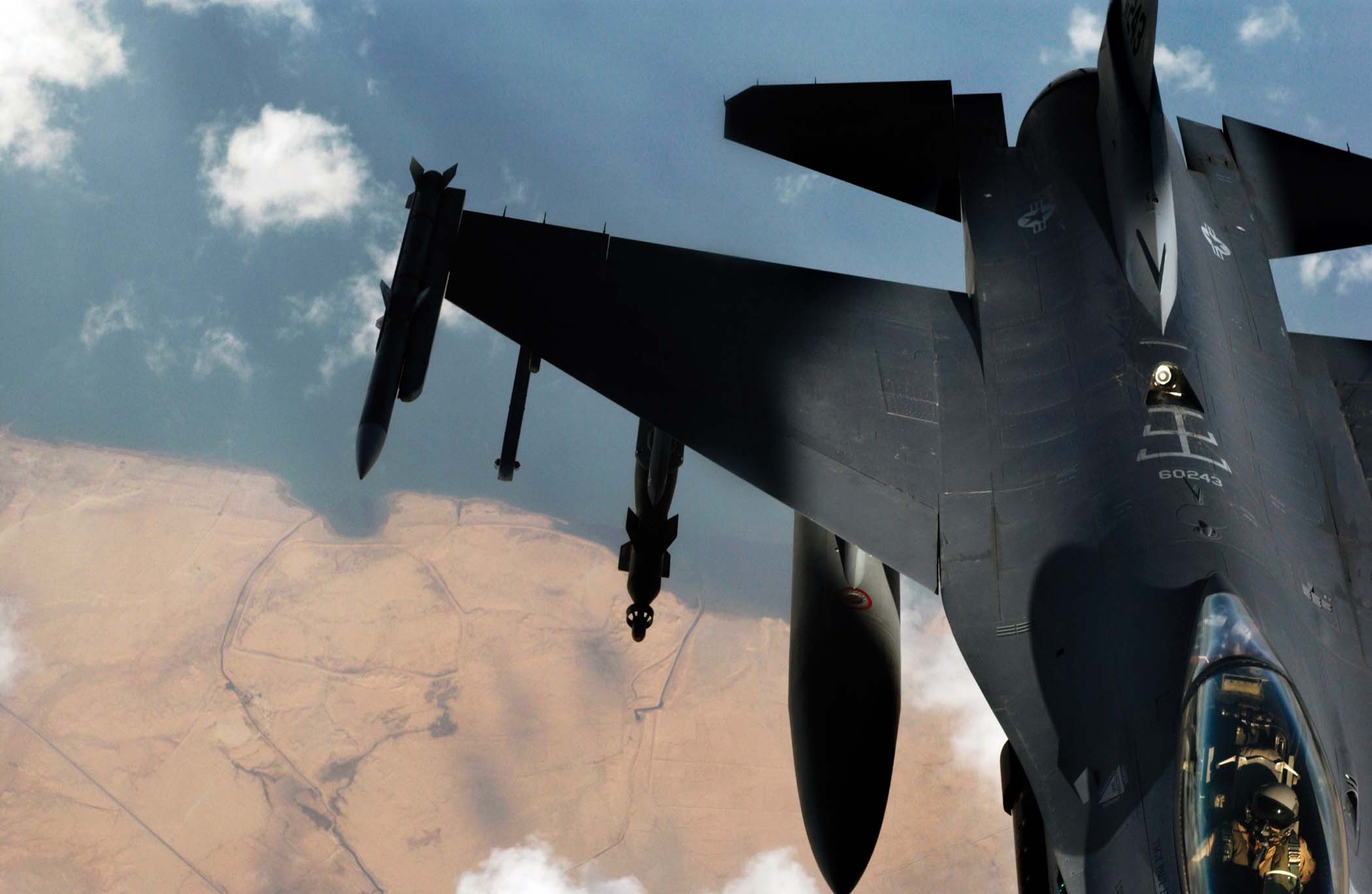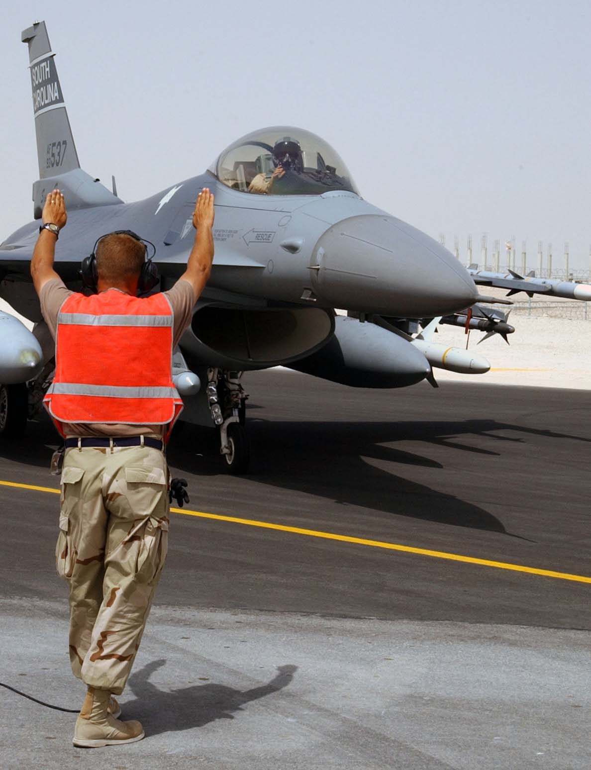 SOUTHWEST ASIA -- Lt. Col. Phil Guy prepares to take off in an F-16 Fighting Falcon. The aircraft is loaded with two AIM-9 missiles and CBU-12 bombs with a Litening II targeting pod to get the precision-guided munitions to the intended target. Guy is assigned to the 149th Fighter Squadron at Richmond, Va. (U.S. Air Force photo by Master Sgt. Lance Cheung)