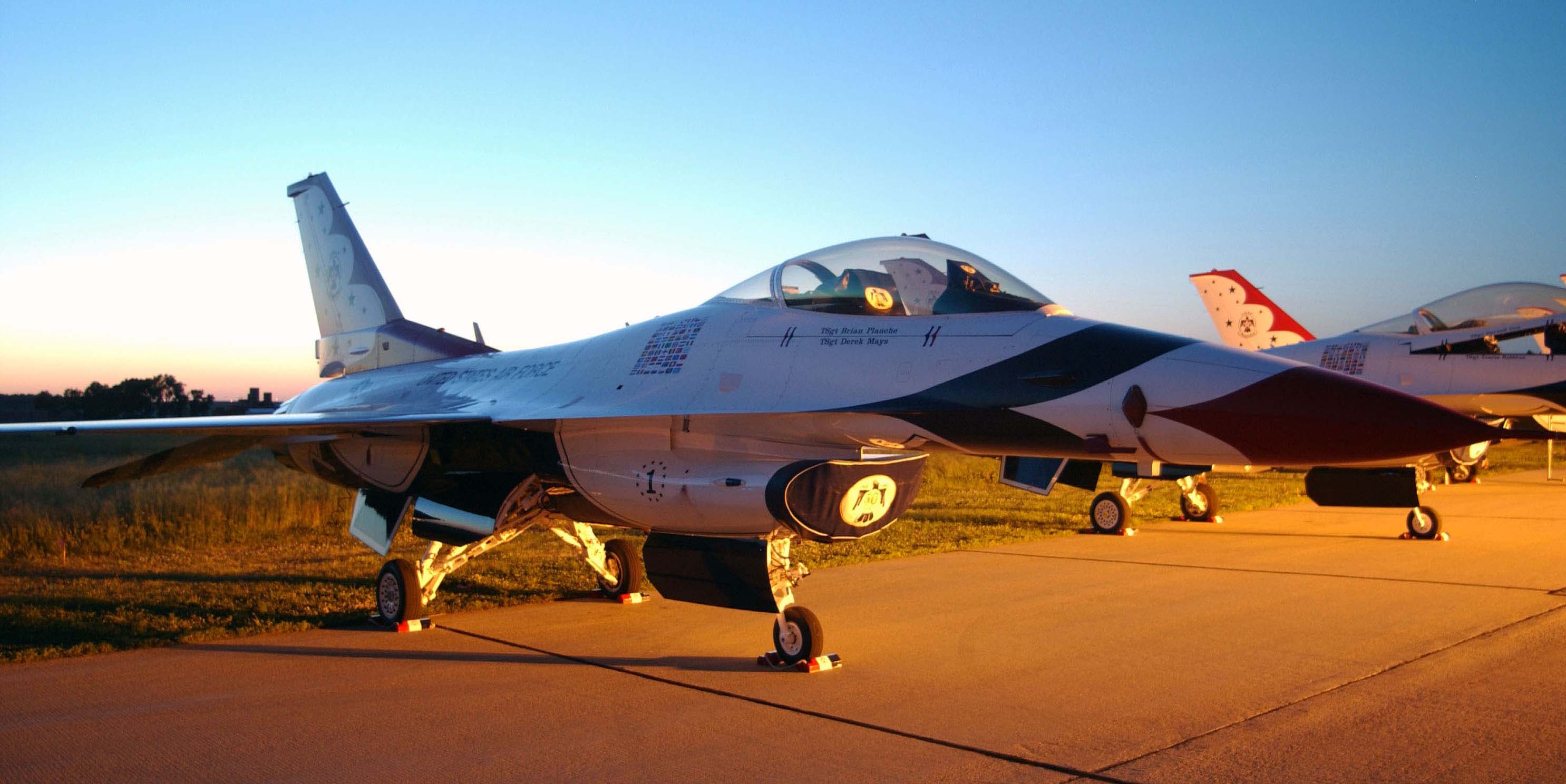 SIOUX FALLS S.D. -- An F-16 Fighting Falcon from the U.S. Air Force Thunderbirds sits on the tarmac at Joe Foss Field, S.D. The premier Air Force aerial demonstration team performed in an air show for 40,000 specatators the following day. (U.S. Air Force photo by Senior Airman Michael Frye)