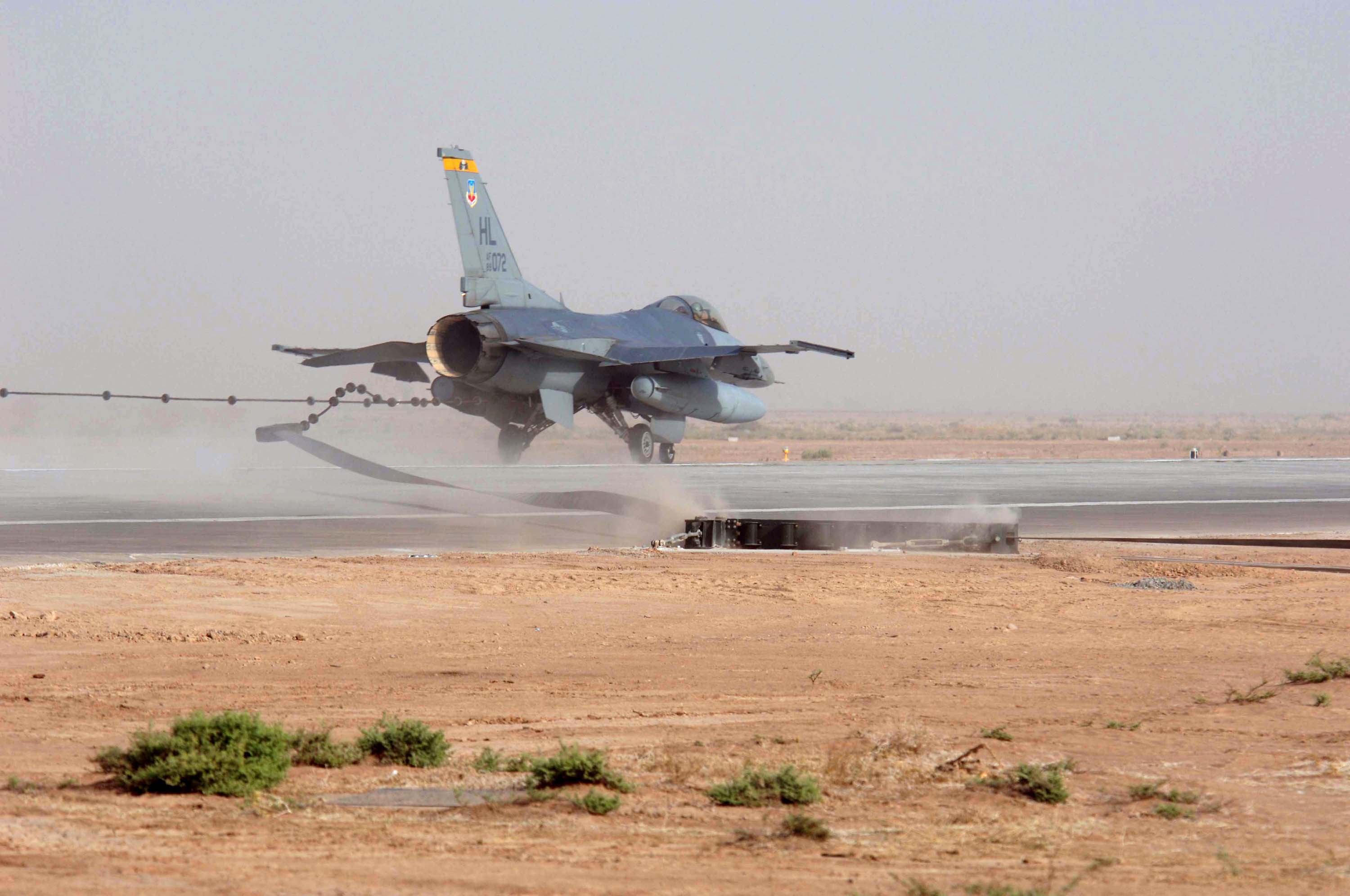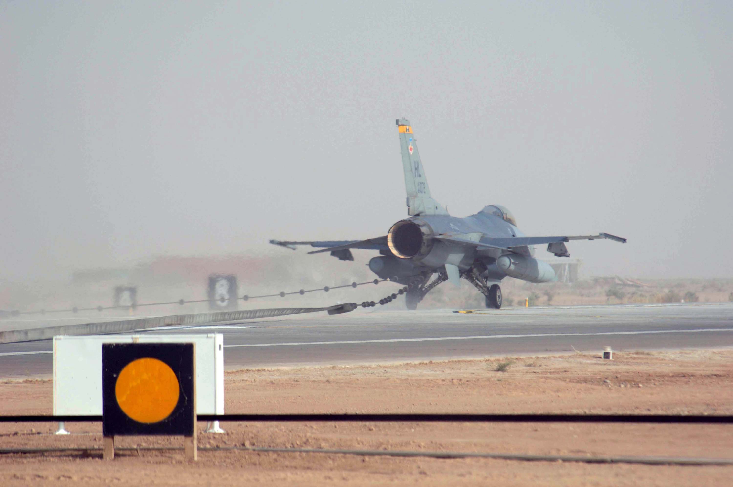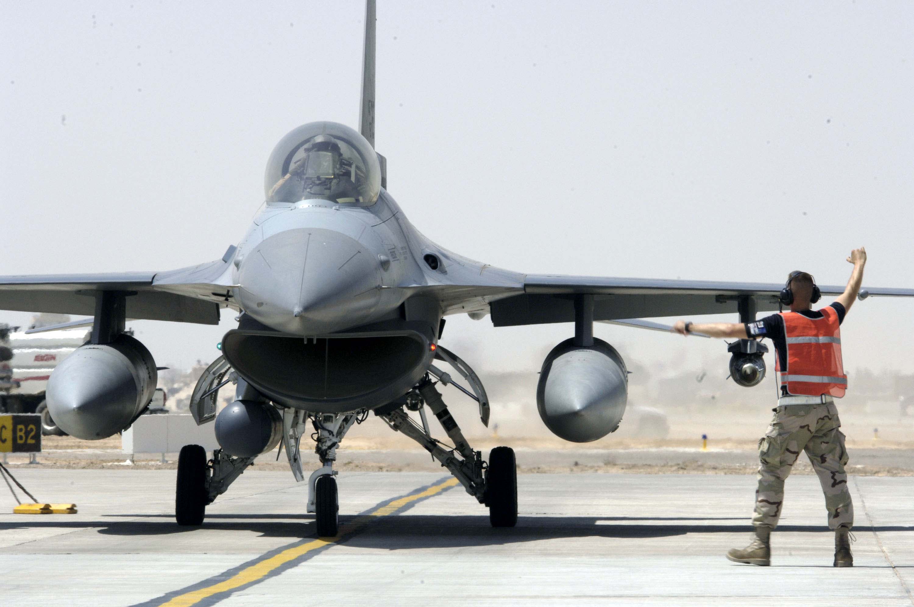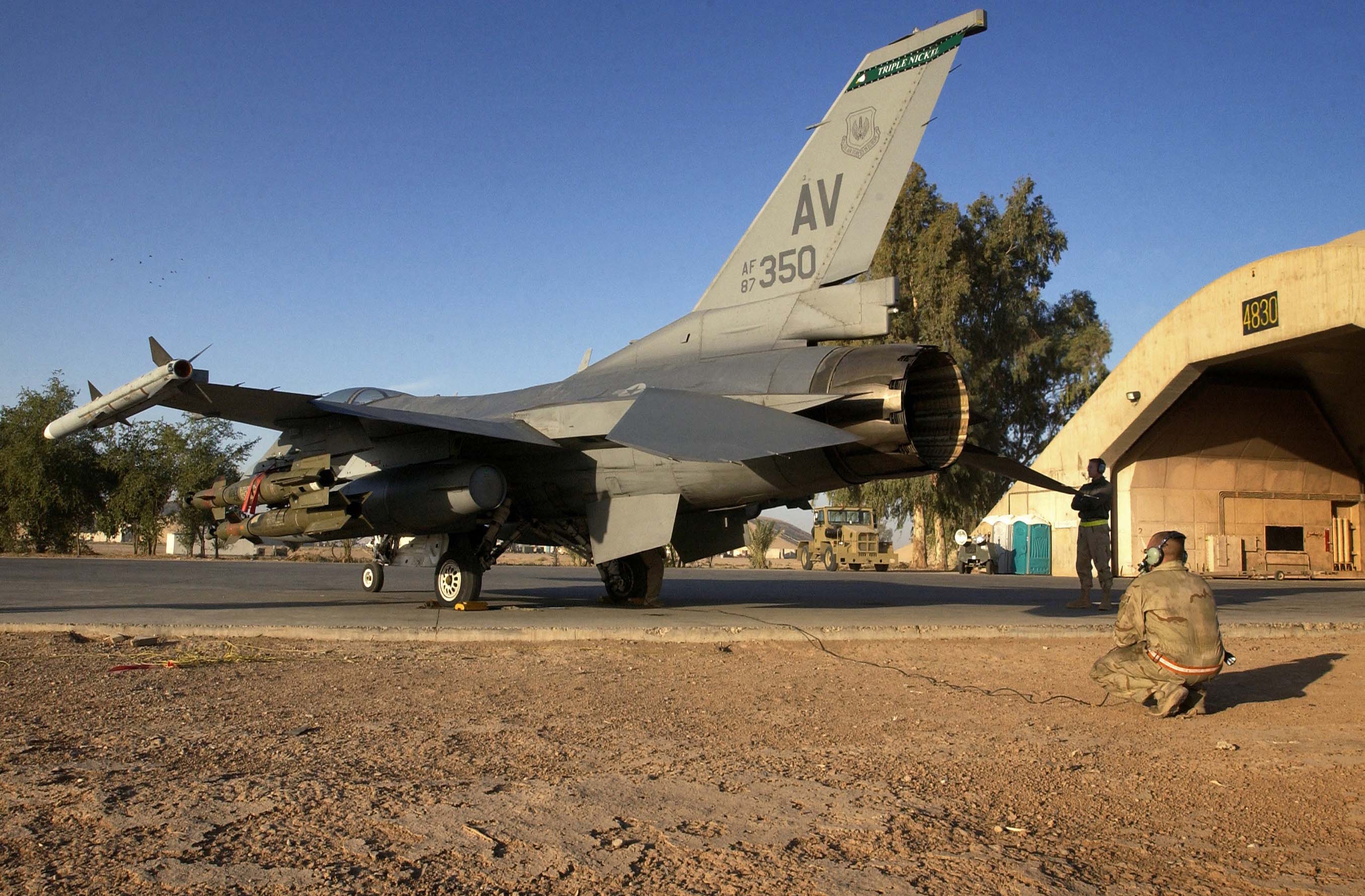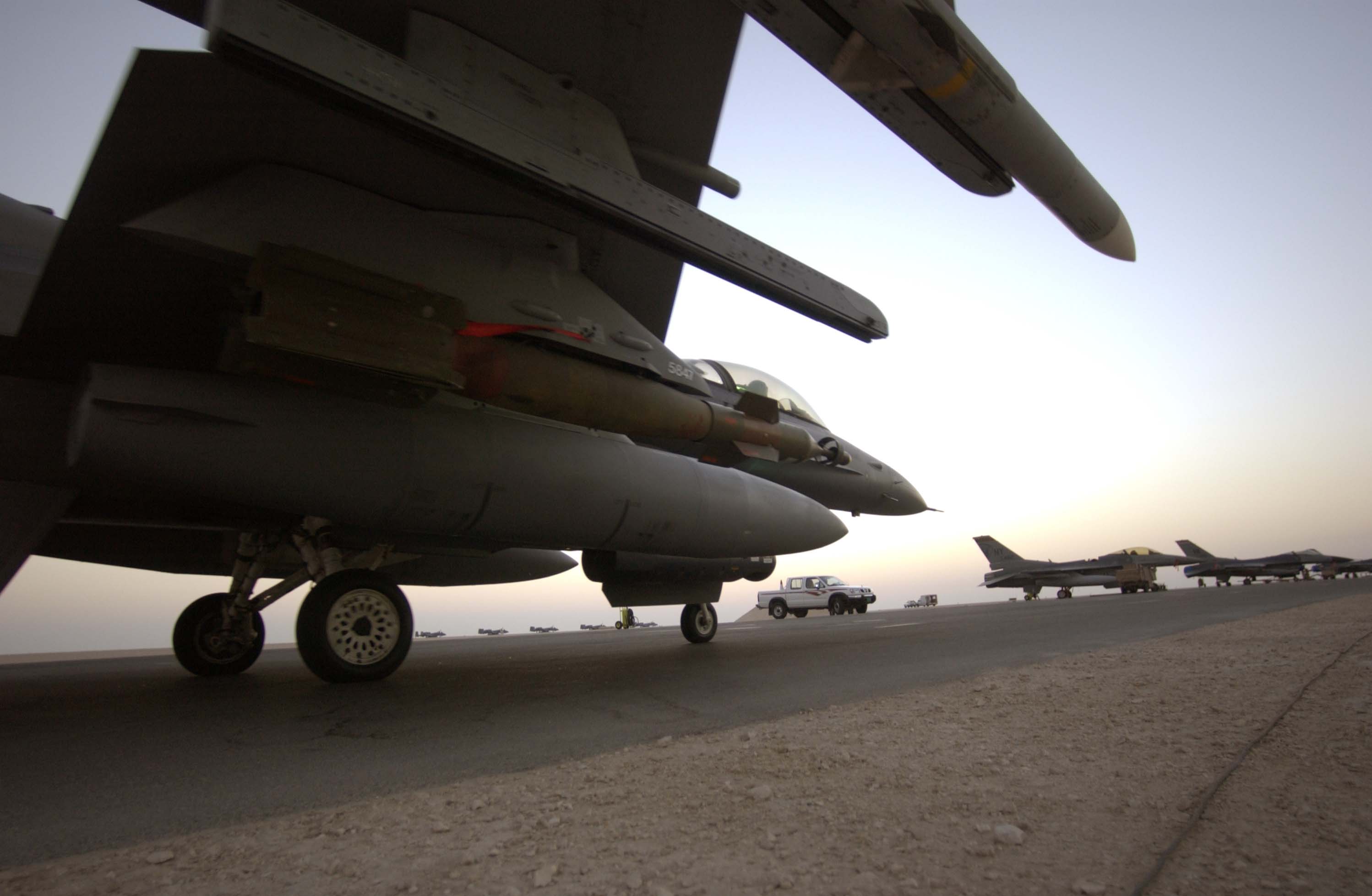 OPERATION IRAQI FREEDOM -- An F-16 Fighting Falcon prepares for take off on an operational sortie at a forward-deployed location March 29. According to a defense official, coalition air forces are averaging about 1,000 sorties a night after the first week of Operation Iraqi Freedom. The Air Force has also dropped more than 5,000 precision-guided munitions. (U.S. Air Force photo by Staff Sgt. Bennie J. Davis III)/