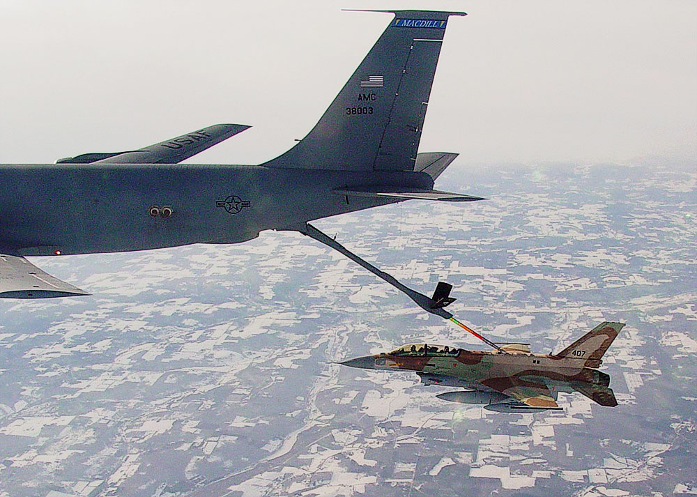 OVER COLORADO -- A KC-135 Stratotanker From the Nebraska Air National Guard refuelings an F-16CJ during a large force employment exercise in conjunction with the inaugural Tiger Meet of the Americas held in Colorado. The "Tigers" of the 79th FS are assigned to Shaw Air Force Base, S.C. The Tiger Meet mirrors the NATO Tiger Meet by bringing together units that have large cats as their mascot or symbol to discuss tactics, fly against and with each other, and move toward the common goal of seamless combat employment. (U.S. Air Force photo by Staff Sgt. Greg L. Davis)